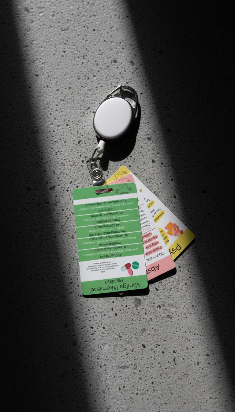 Ett knippe med 3 dubbelsidiga praktiska kort i fickformat, framtagna för att stödja vårdpersonal inom psykiatrin i akuta och vardagliga situationer. Korten är designade för snabb åtkomst och tydlig översikt - en pålitlig följeslagare på jobbet.