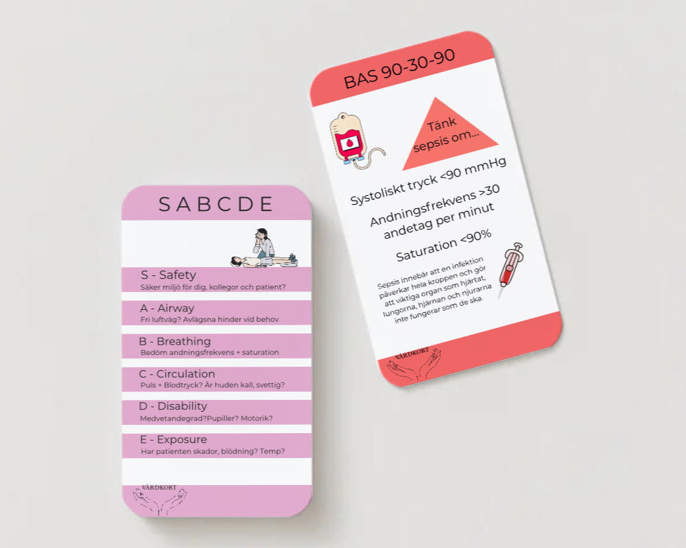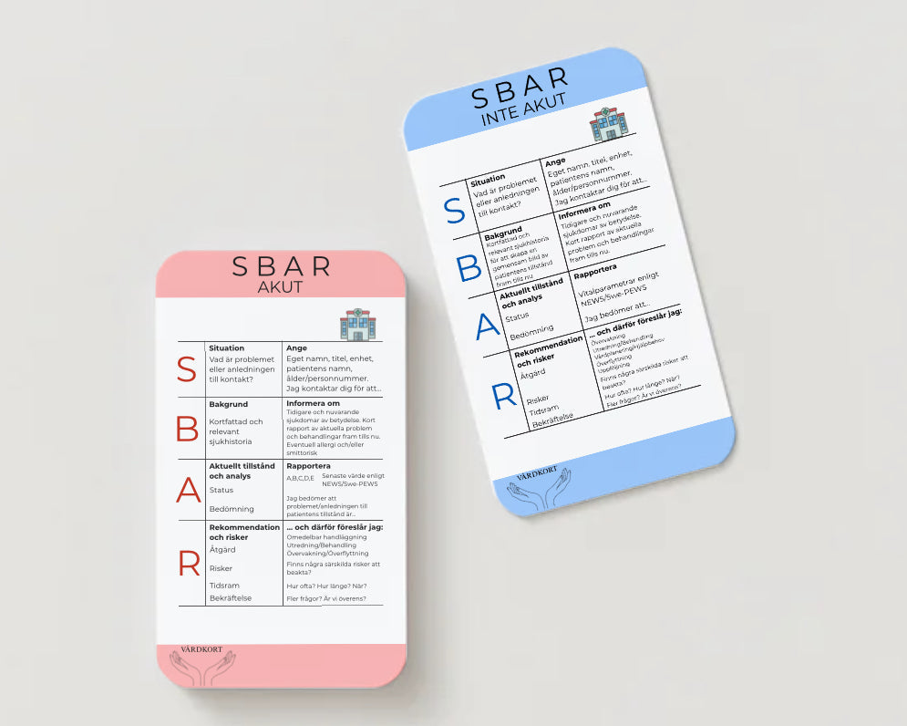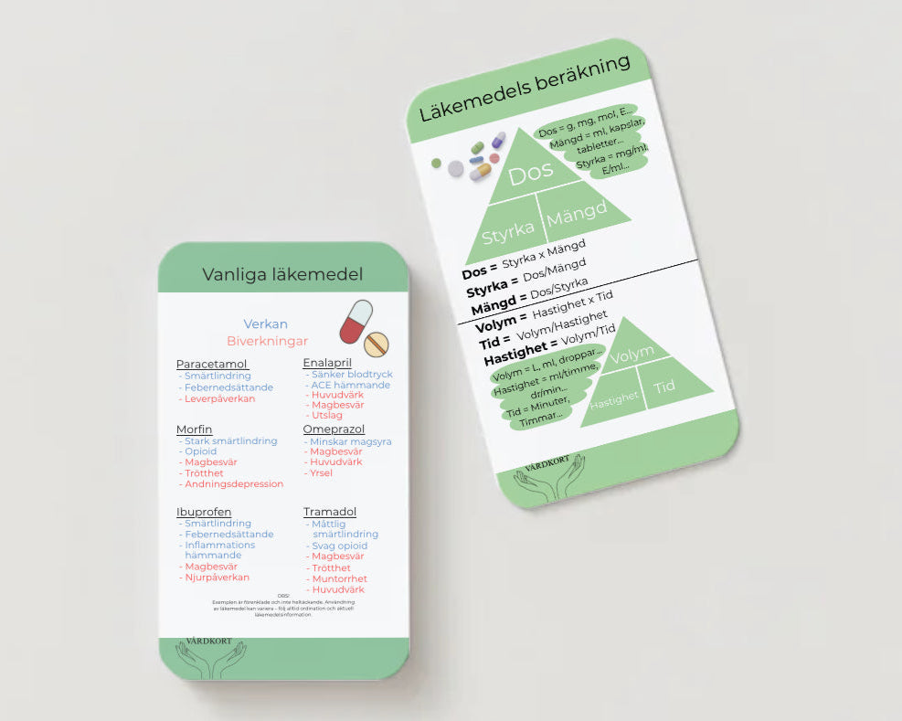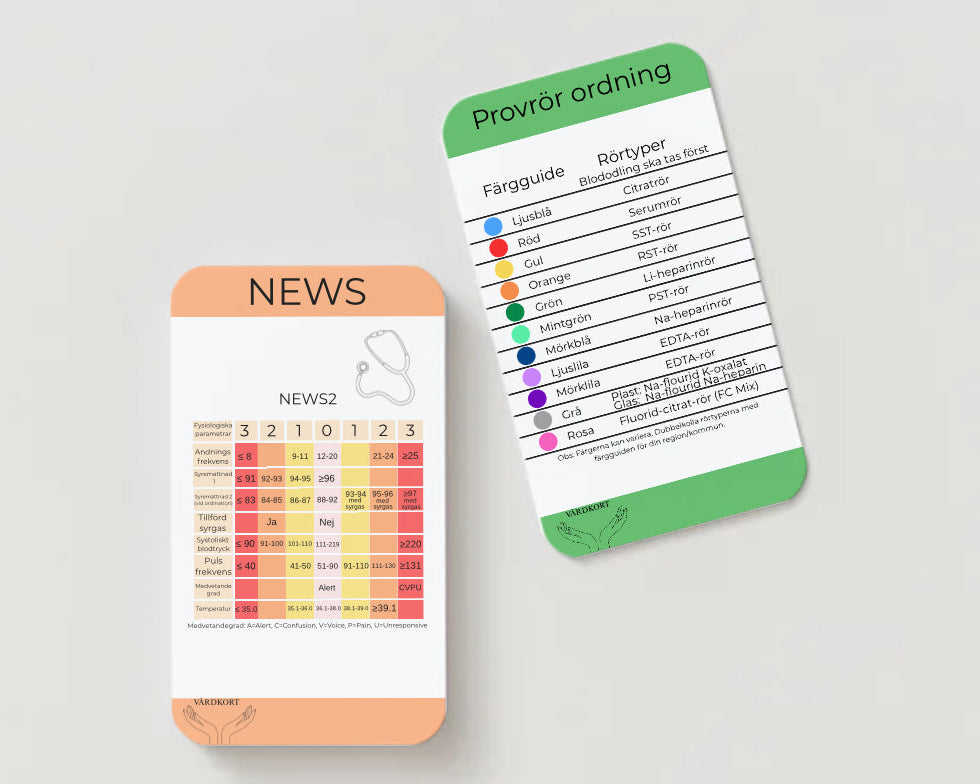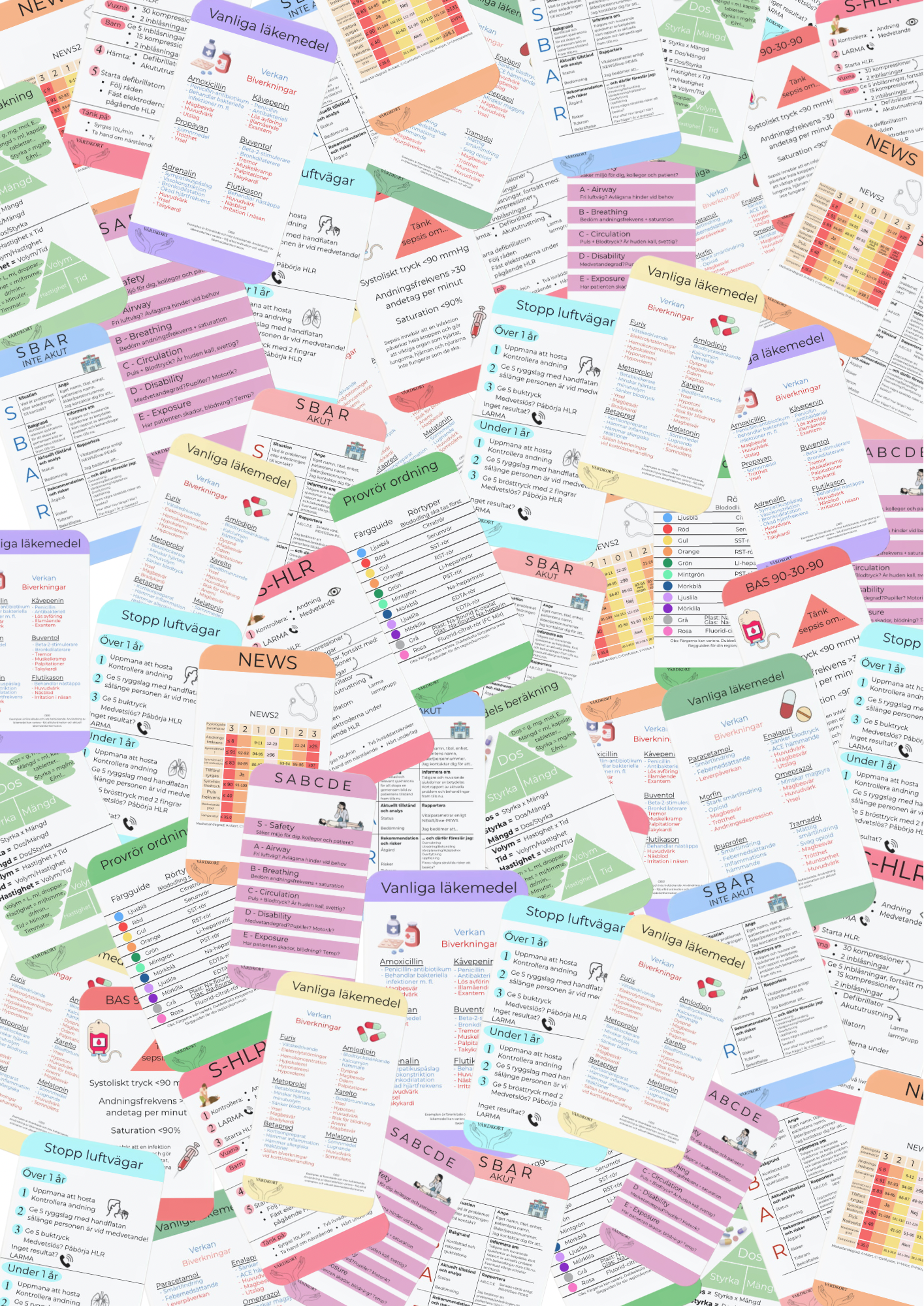 Ett knippe med 6 dubbelsidiga praktiska kort i fickformat, framtagna för att stödja allmän vårdpersonal i akuta och vardagliga situationer. Korten är designade för snabb åtkomst och tydlig översikt - en pålitlig följeslagare på jobbet.